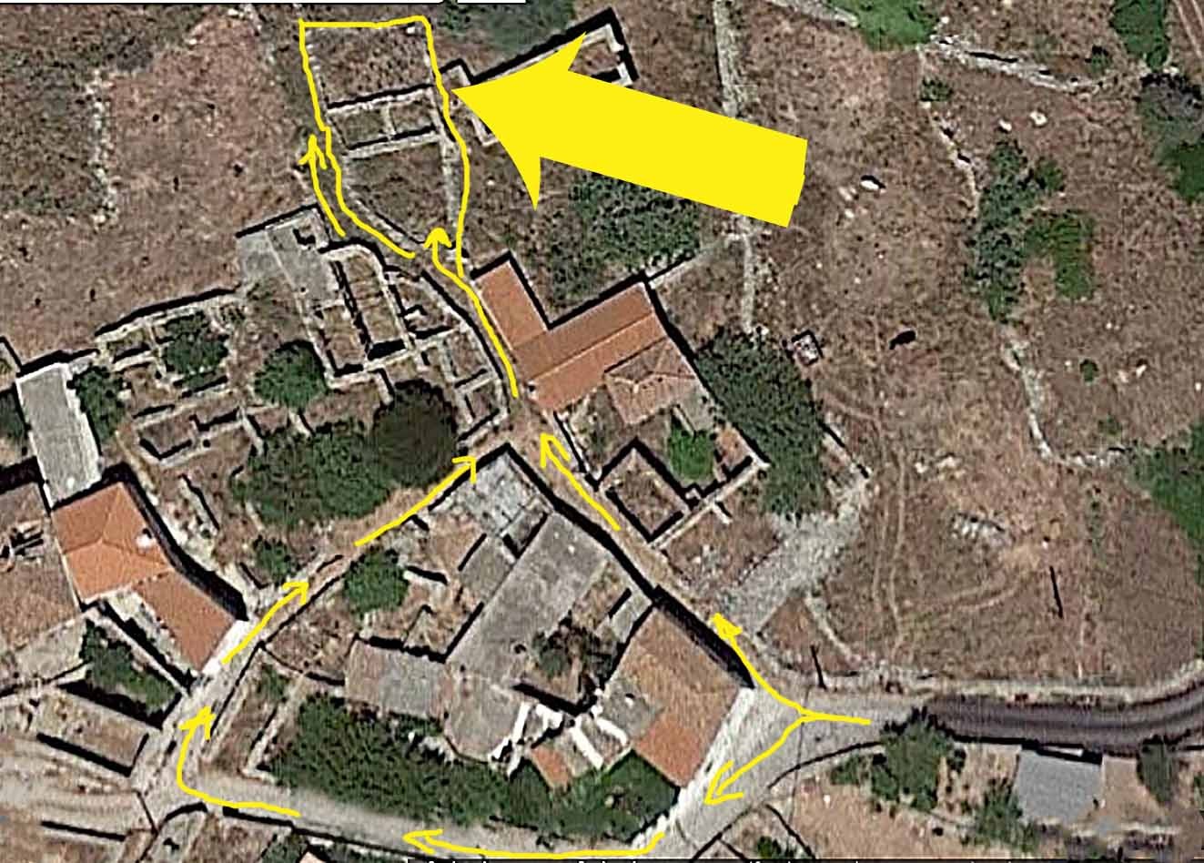 Η εισοδος απο την ασφαλτο του δρομου μεσα απο δυο εμπασιες. Στο χαρτη Google maps οι συντεταγμενες ειναι: 36.292250, 22.951915